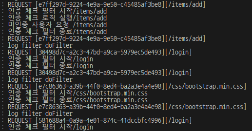 javax.servlet의 필터 인터페이스를 implement 시킨 후, URL요청과 랜덤 uuid값을 로그에 남기도록 작성했습니다.