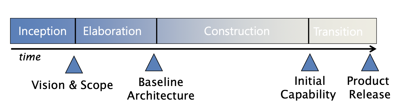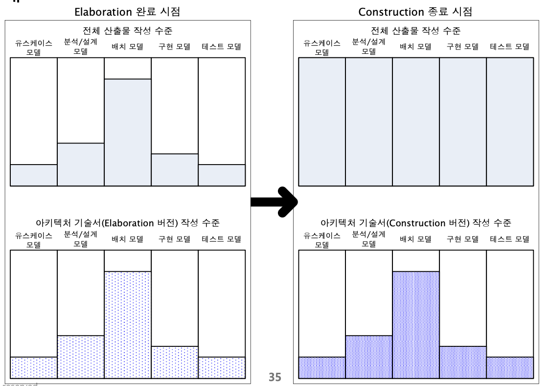아래 그림을 보면 Elaboration 완료 시점(베이스라인 아키텍쳐가 구축됐을때) 산출물 작성시점이랑, Construction(베이스라인 아케텍쳐는 살짝만 변경되고 코드 작성에 집중하는 Phase)의 산출물 작성 시점을 비교해서 볼수 있습니다.