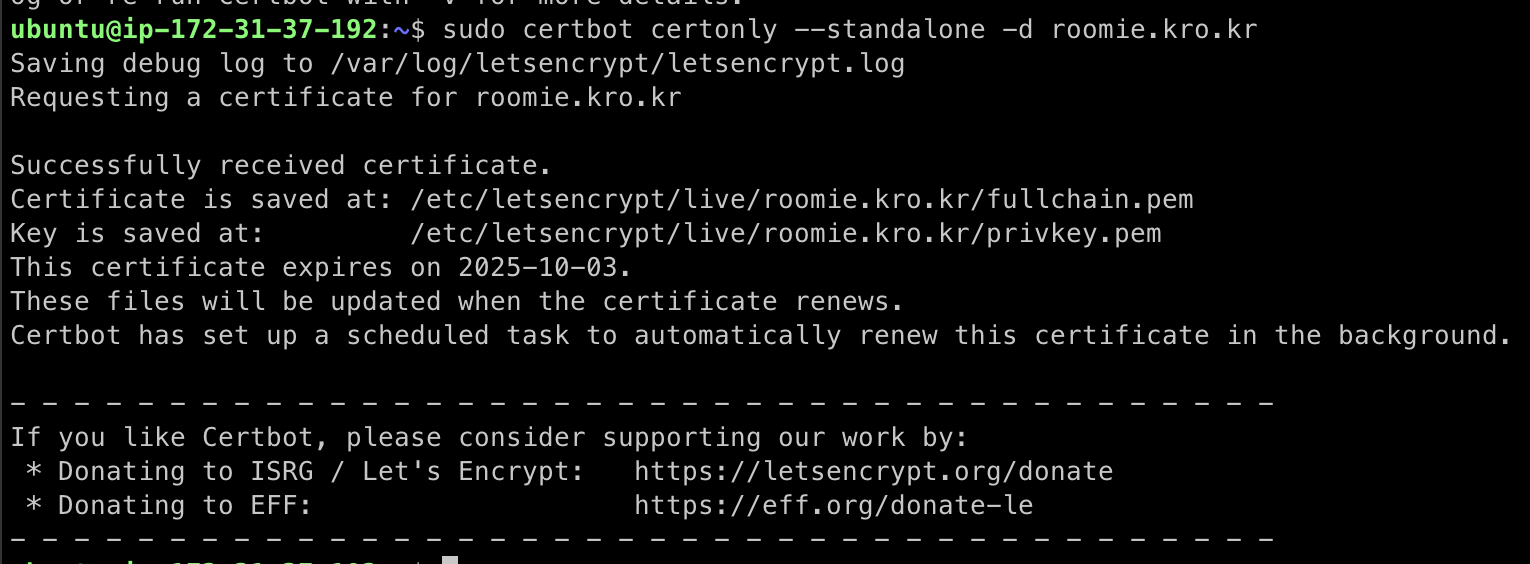 - 인증서 파일이 /etc/letsencrypt/live/도메인이름/에 생성됩니다.