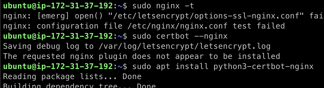- Nginx 설정에서 include /etc/letsencrypt/options-ssl-nginx.conf; 구문이 있는데, 해당 파일이 없어서 Nginx 설정 테스트에 실패한 상황입니다.