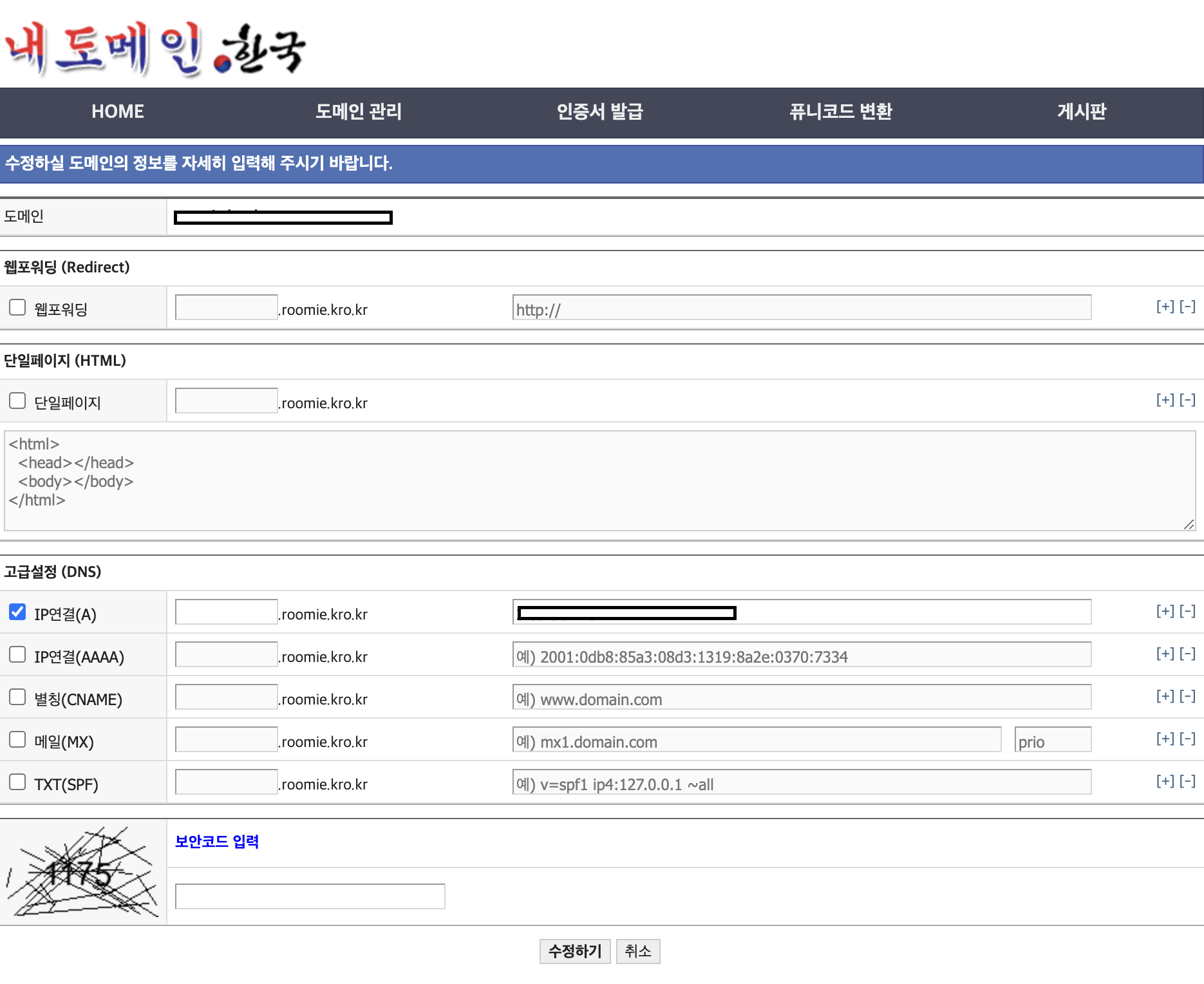 - 내도메인.한국 등에서 발급받고, 도메인 관리에서 A레코드에 EC2 퍼블릭 IP를 연결합니다.