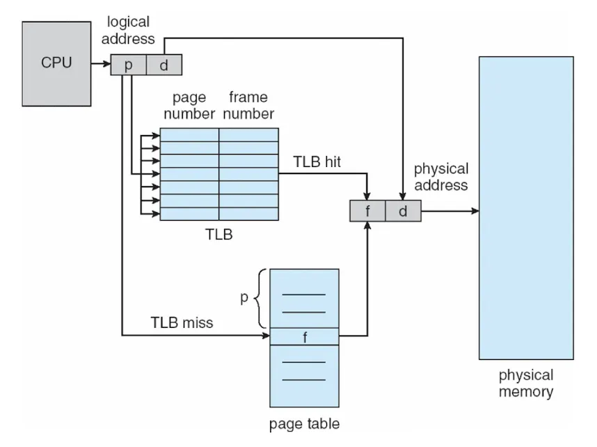 Virtual Address → Physical Address 변환을 빠르게 하려고 TLB(Translation Lookaside Buffer)라는 캐시 사용