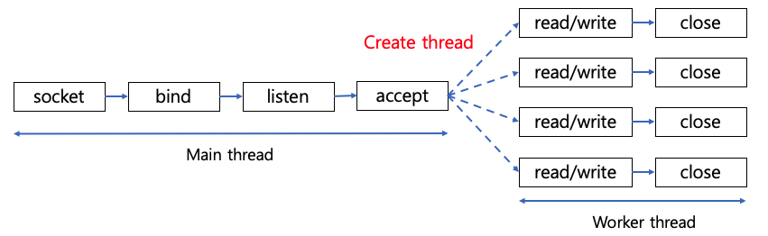 - 클라이언트 요청마다 read()와 같은 함수 호출이 socket 단위로 blocking된다.