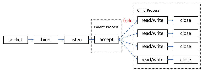 - fork()를 통해 자식 프로세스를 생성하고, 새로 생성된 소켓(리스닝 소켓이 아님)의 파일 디스크립터를 자식 프로세스에게 넘긴다.