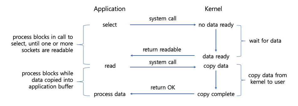 - select, poll 등의 system call을 통해 여러 소켓을 동시에 감시한다.
