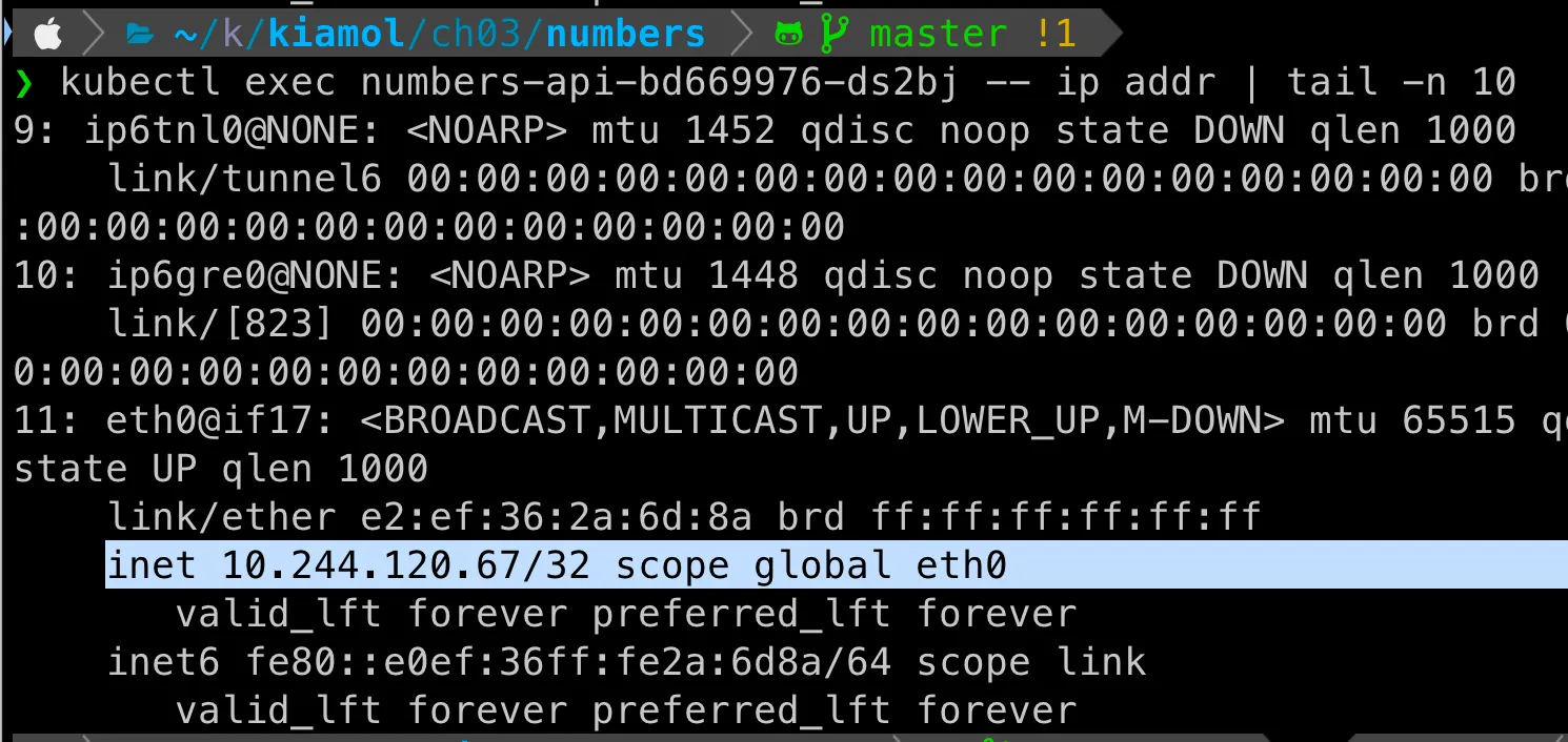 - A KUBE-SEP-E4SSCTGR3GJGHN43 -p tcp -m comment --comment "default/numbers-api" -m tcp -j DNAT --to-destination 10.244.120.67:80