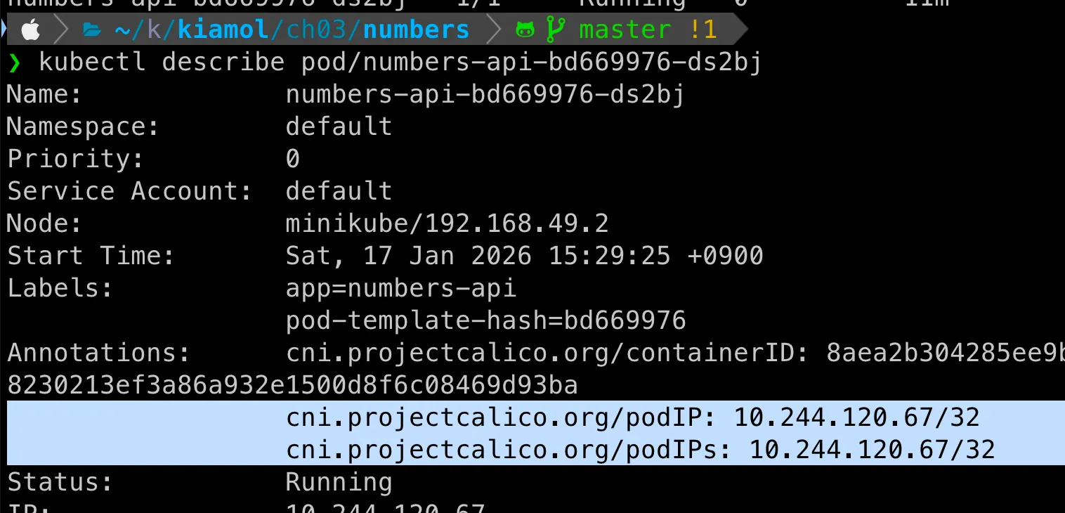 파드의 IP는 Calico(CNI)가 가상 IP 10.244.120.67로 할당해준것을 볼 수 있다.