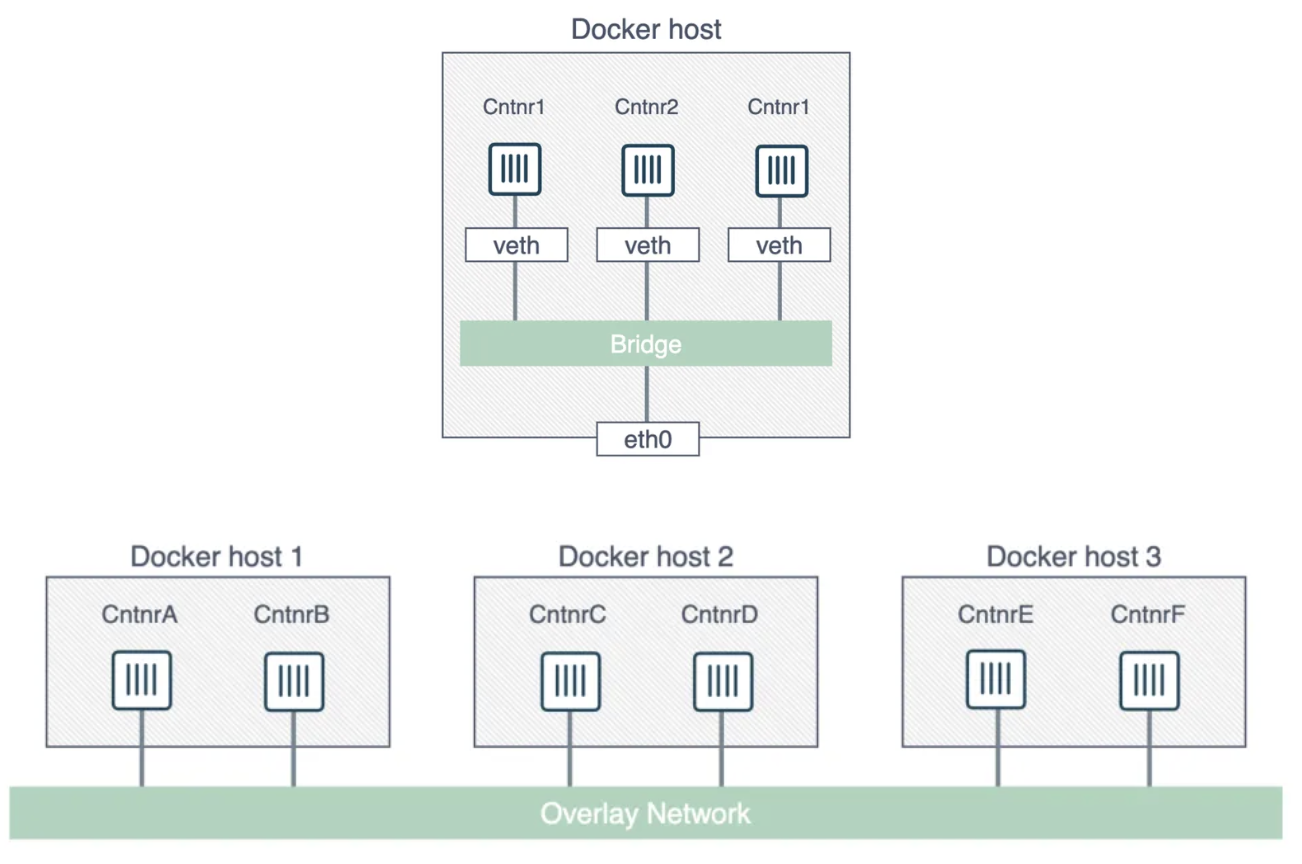 - 각 호스트에서 docker0 브릿지 생성 → 컨테이너 veth pair를 브릿지에 붙인다.