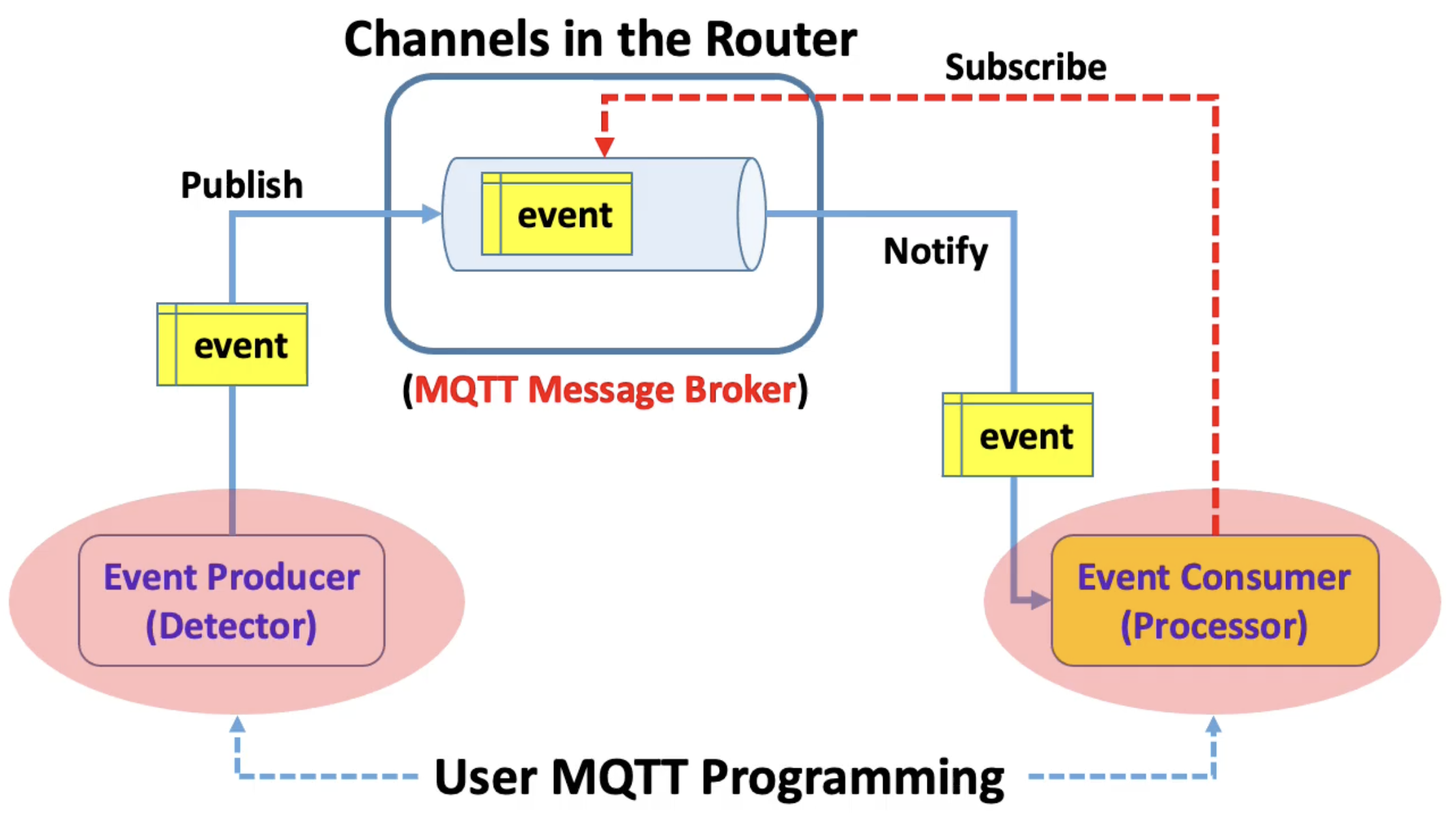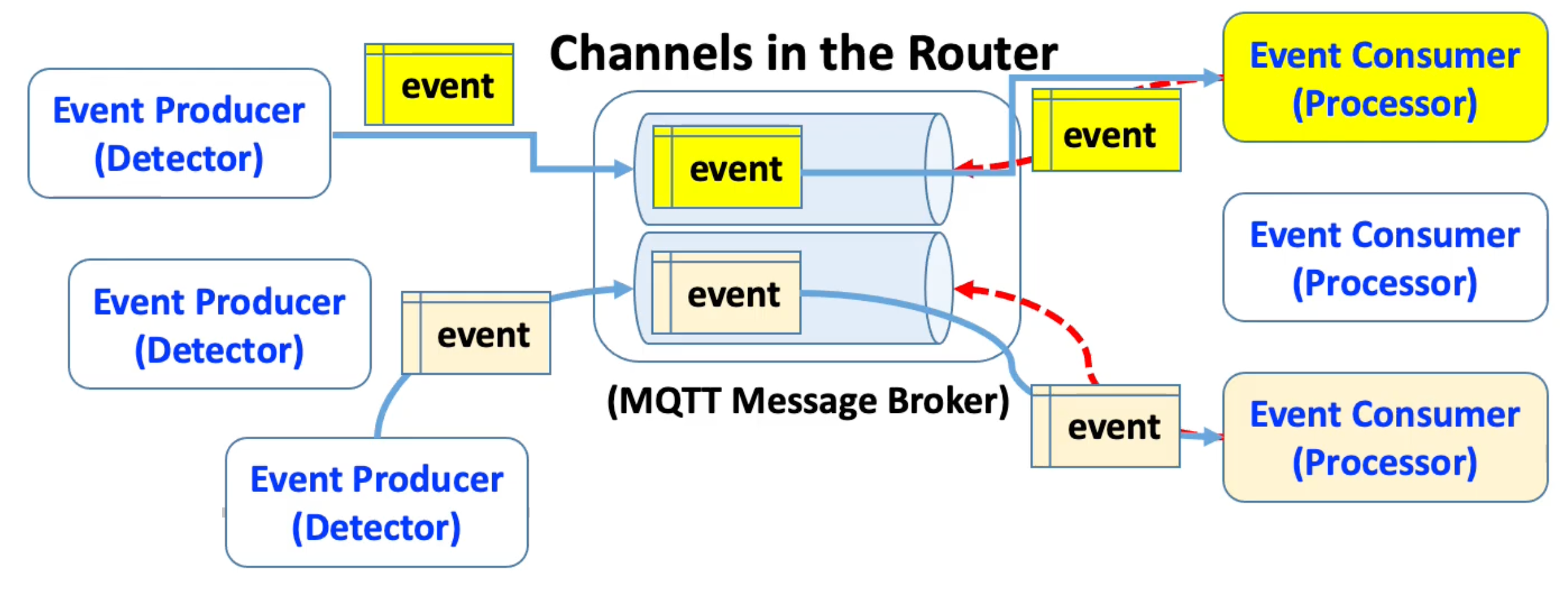 - Event Consumer가 관심 있는 Channel(Topic)을 미리 Subscribe 합니다 (빨간 점선).